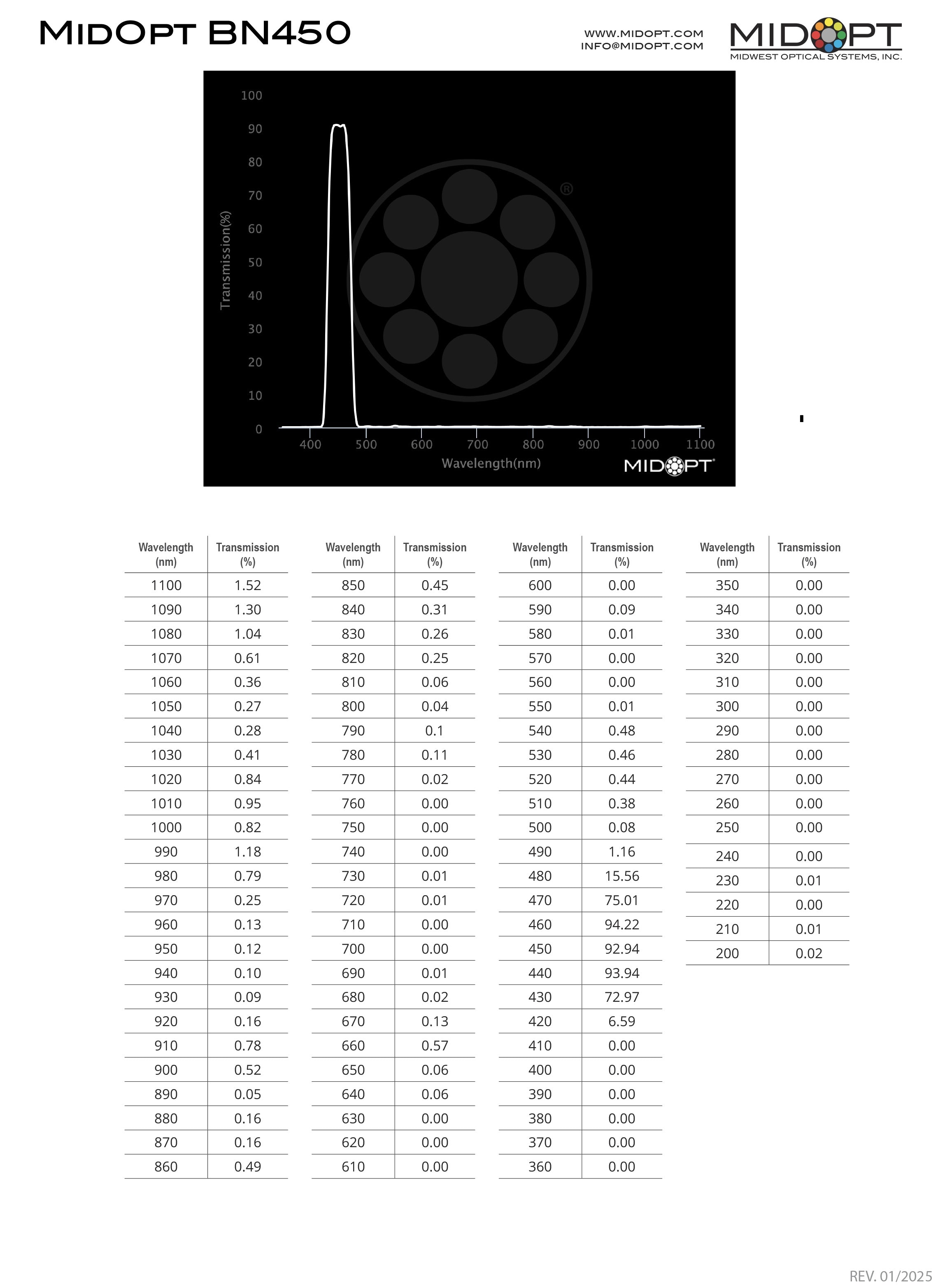 The MidOpt BN450 Narrow Indigo Bandpass Filter is commonly used in fluorescence applications with an emission ranging from 430-460nm. The BN450 is recommended for use in LED or laser diode applications with higher than normal ambient lighting conditions. It's ideal for applications utilizing 450nm blue laser triangulation sensors. MidOpt Bandpass Filters have a broad, Gaussian passband to mimic and accommodate the entire output of the most common LED wavelengths, are double-side polished for exceptional parallelism and optical flatness, are anti-reflection (AR) coated to limit glare and minimize reflection loss and have StablEDGE technology to reduce angular dependency and minimize the effects of short-shifting.