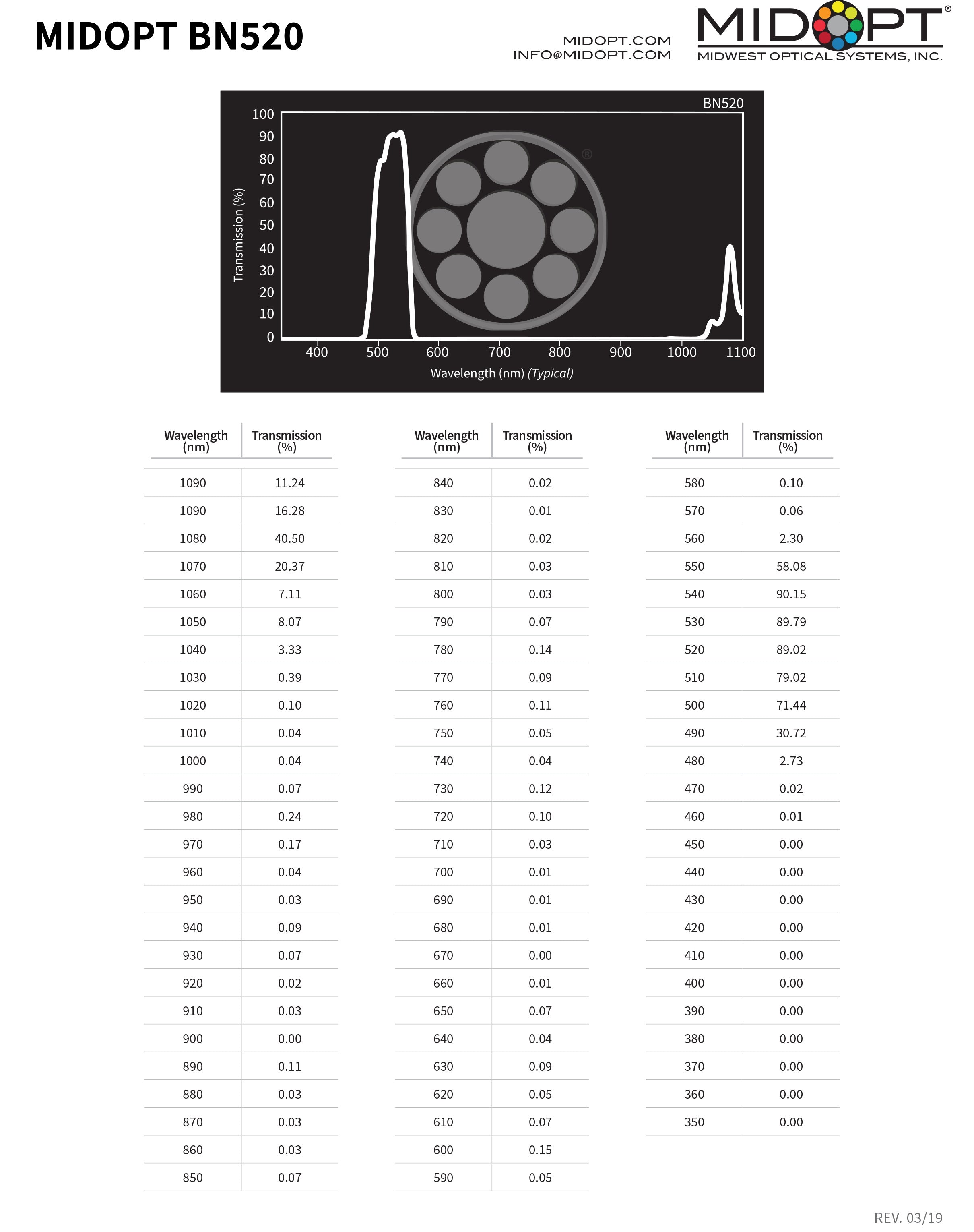 The MidOpt BN520 Narrow Green Bandpass Filter is designed to isolate green wavelengths while blocking out-of-band light, increasing contrast and resolution and improving system performance and repeatability. MidOpt Bandpass Filters have a broad, Gaussian passband to mimic and accommodate the entire output of the most common LED wavelengths, are double-side polished for exceptional parallelism and optical flatness, are anti-reflection (AR) coated to limit glare and minimize reflection loss and have StablEDGE technology to reduce angular dependency and minimize the effects of short-shifting.
