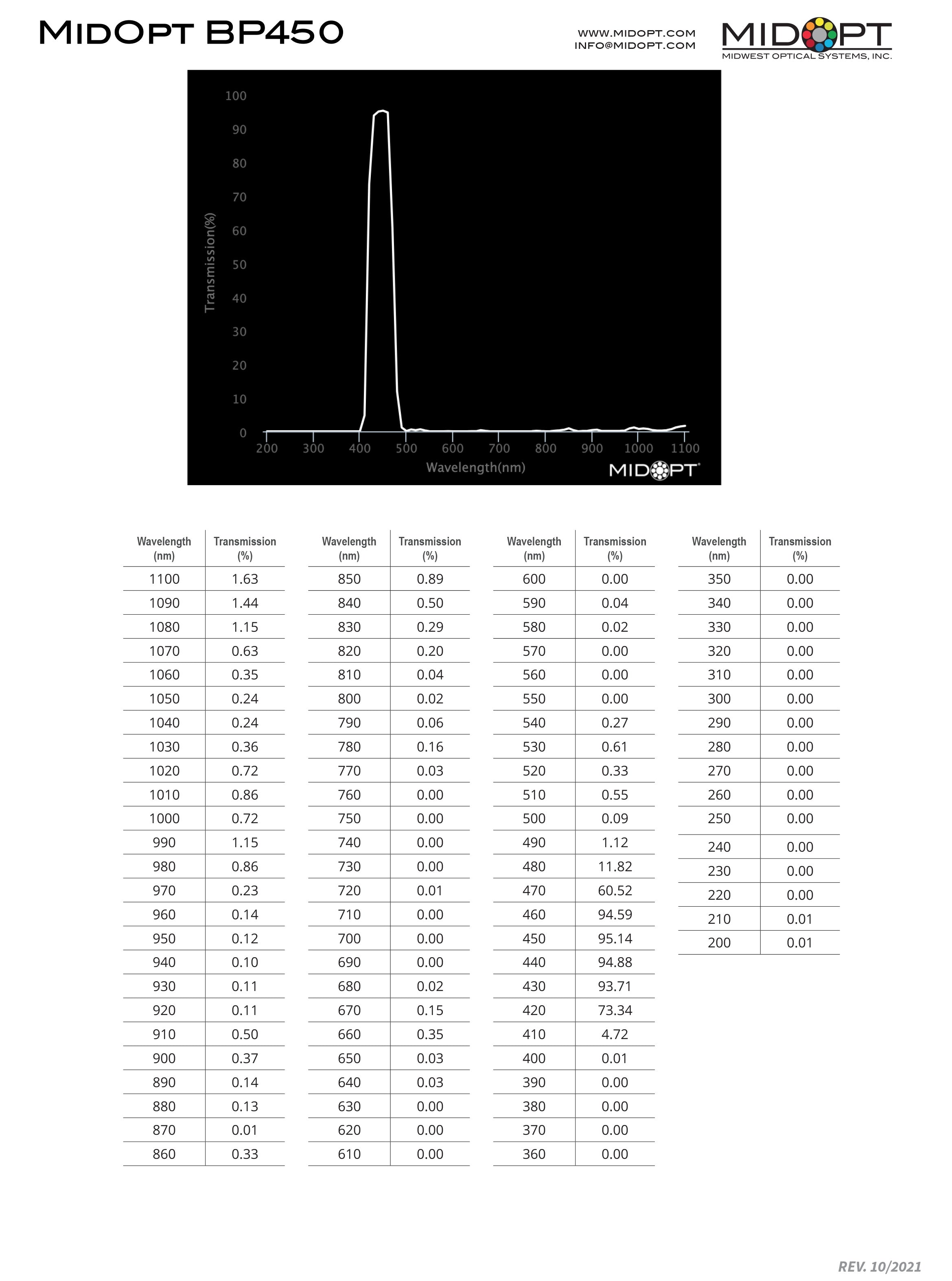 The MidOpt BP450 Indigo Bandpass Filter enhances the viewing of subjects illuminated by a 450nm blue LED or laser light source and any ultraviolet (UV)-excited blue fluorescence emission (420-470nm). Its broad bandwidth and high peak (T ≥90%) transmission results in significantly brighter, higher contrast images. For most machine vision UV fluorescence applications, a Bandpass Filter is absolutely necessary. MidOpt Bandpass Filters have a broad, Gaussian passband to mimic and accommodate the entire output of the most common LED wavelengths, are double-side polished for exceptional parallelism and optical flatness, are anti-reflection (AR) coated to limit glare and minimize reflection loss and have StablEDGE technology to reduce angular dependency and minimize the effects of short-shifting.