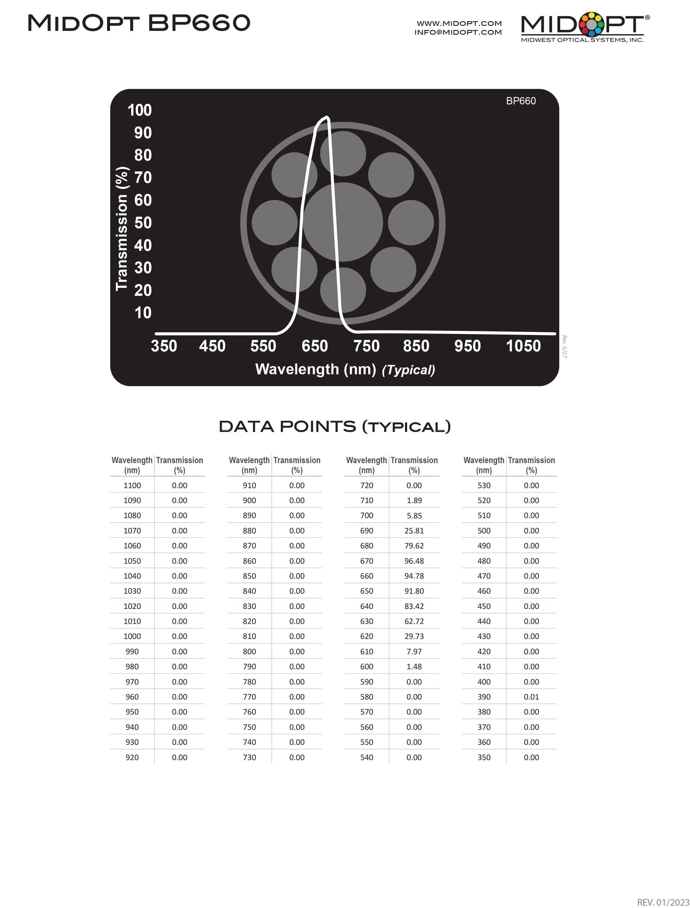 The MidOpt BP660 Dark Red Bandpass Filter is recommended for use with 650-680nm LED and laser diode lighting. Because of the ample passband and excellent in-band transmission, it works well with all camera-related applications in this range. MidOpt Bandpass Filters have a broad, Gaussian passband to mimic and accommodate the entire output of the most common LED wavelengths, are double-side polished for exceptional parallelism and optical flatness, are anti-reflection (AR) coated to limit glare and minimize reflection loss and have StablEDGE technology to reduce angular dependency and minimize the effects of short-shifting.