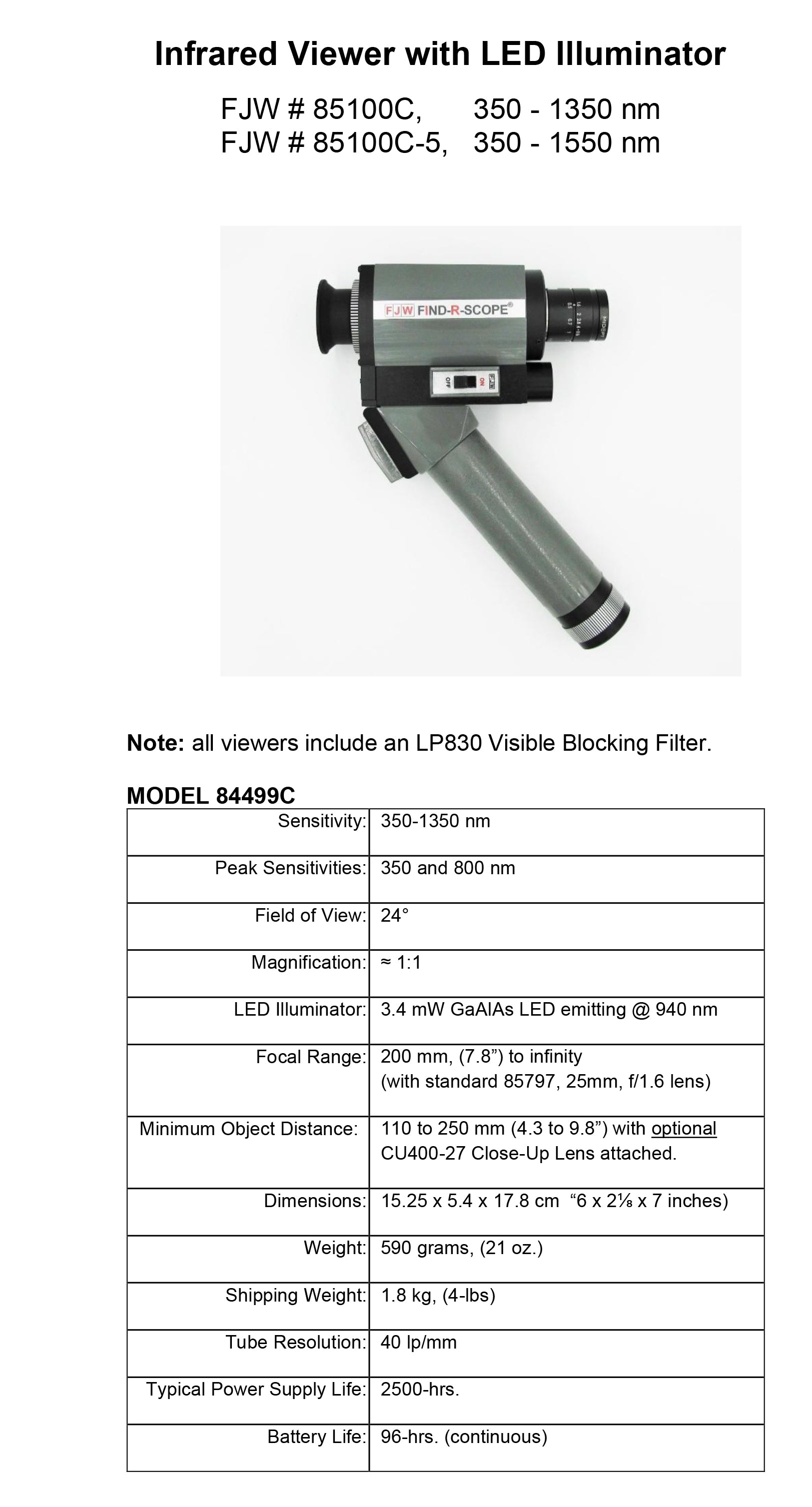 Available in two sensitivity ranges (350-1350nm (85100C) and 350-1550nm (85100C-5)) the FindRScope® 85100C series supports a wide range of applications including IR source detection, laser alignment, inspection, research and surveillance. Both models include a built-in 940nm GaAlAs LED illuminator and a factory-installed LP830 visible blocking filter, improving signal-to-noise performance by eliminating unwanted visible light.