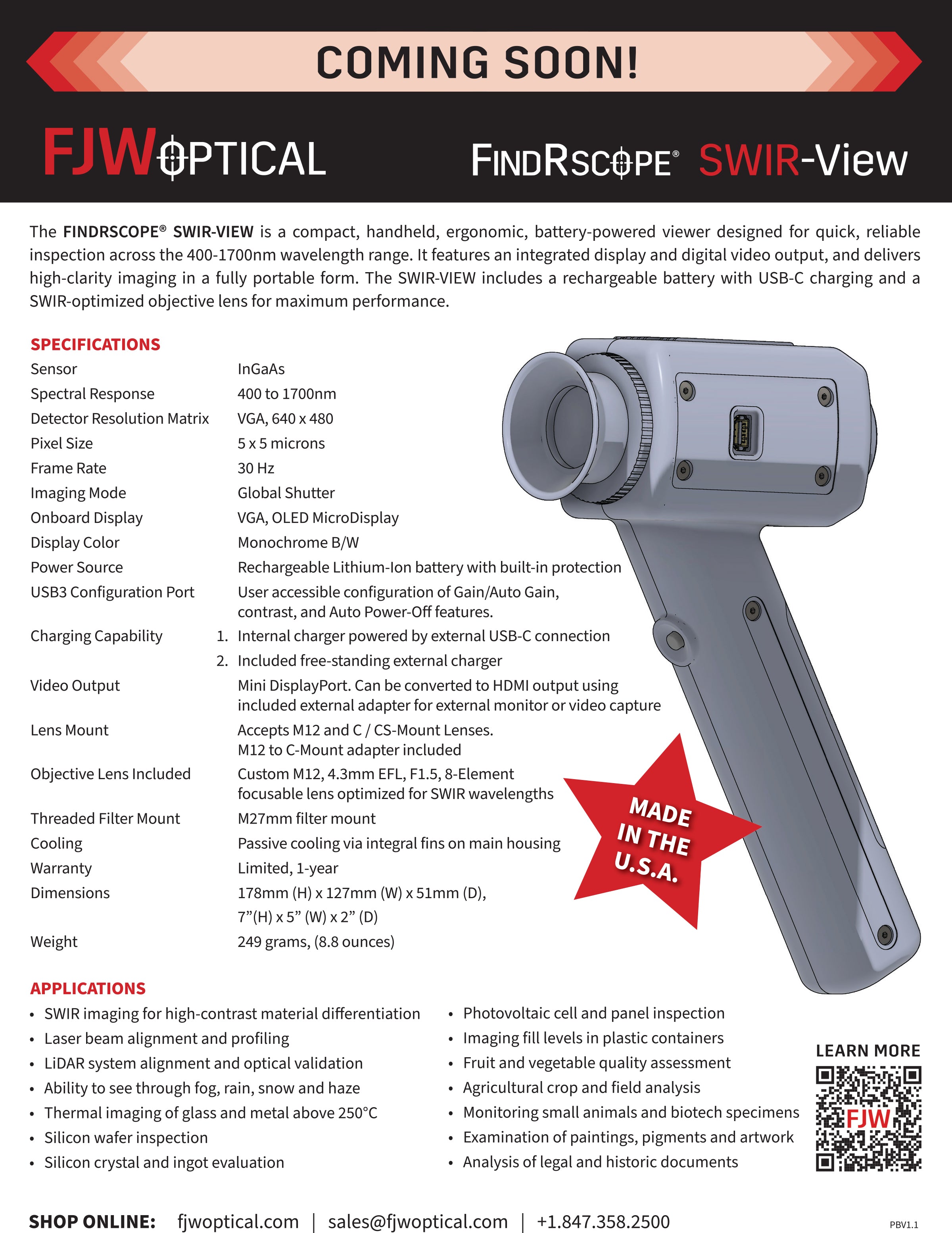 Coming Soon: The Redesigned FJW Find-R-Scope – now with expanded spectral vision. The all-new Find-R-Scope SWIR-View is a reimagined, portable short-wave infrared (SWIR) viewer that builds on a trusted legacy. Covering a broad wavelength range of 400–1700nm, this ergonomic, battery-powered device features an integral display for real-time viewing and digital video output for seamless system integration.