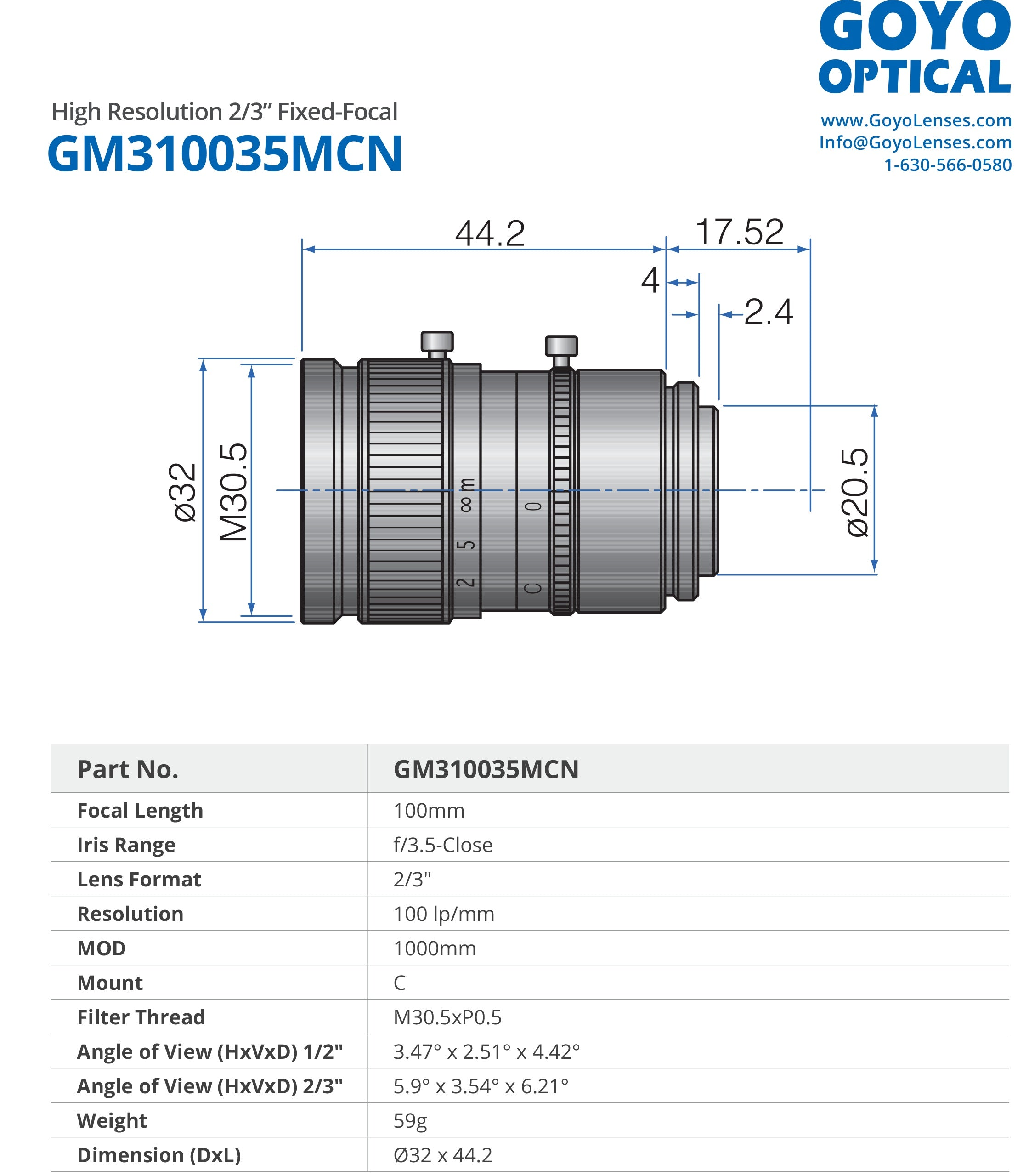 GOYO - GM310035MCN, 100mm, 2/3in, f/3.5-Close, Fixed Focal Lens, C Mount