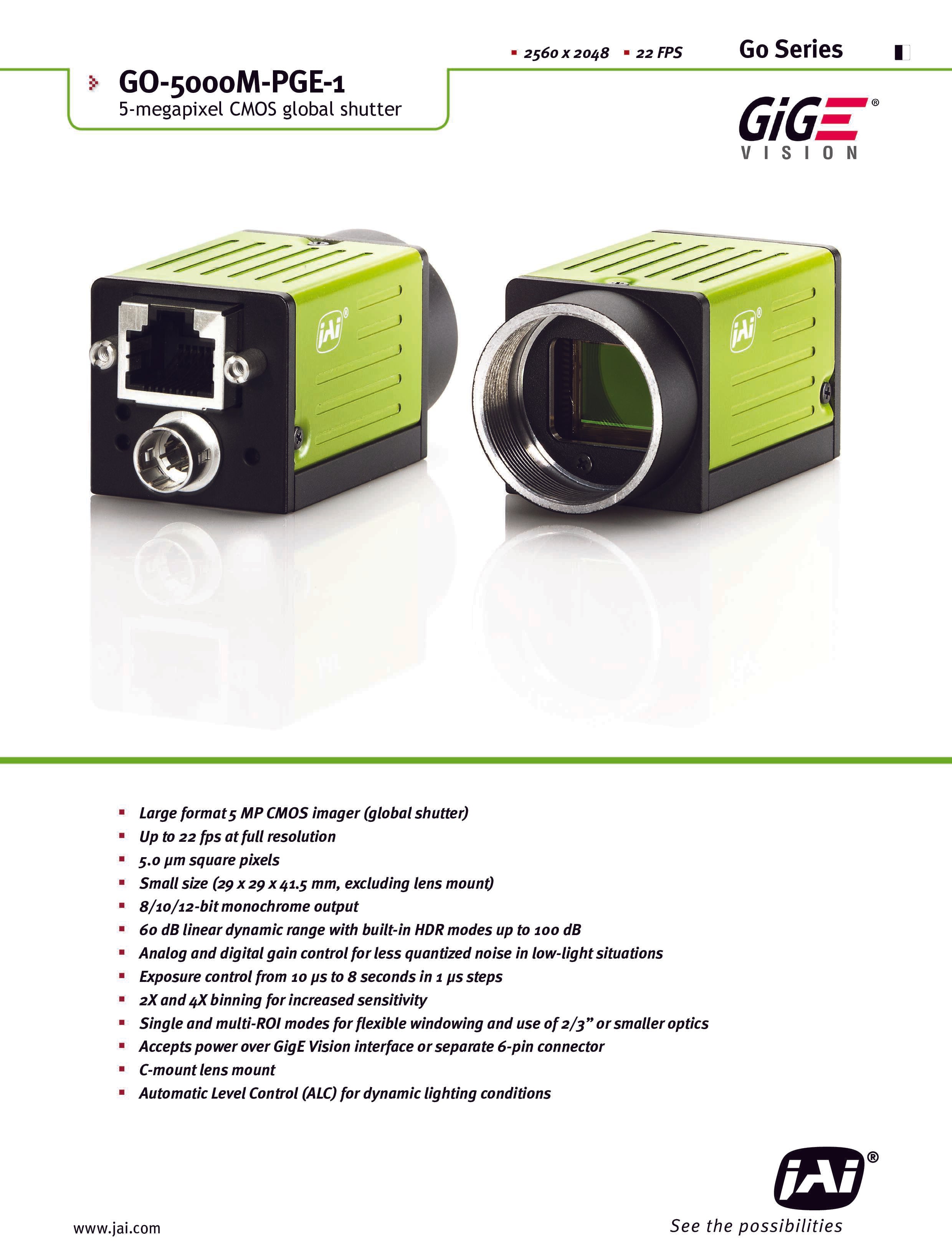 The JAI GO-5000M-PGE-1 Compact 5 Megapixel (MP) Area Scan Camera from the Go Series is a compact industrial area scan camera delivering an excellent blend of size, versatility and performance. It delivers 5 MP monochrome output at up to 22 fps, with flexible ROI and binning capabilities that enable the camera to be tailored to a wide range of machine vision applications.