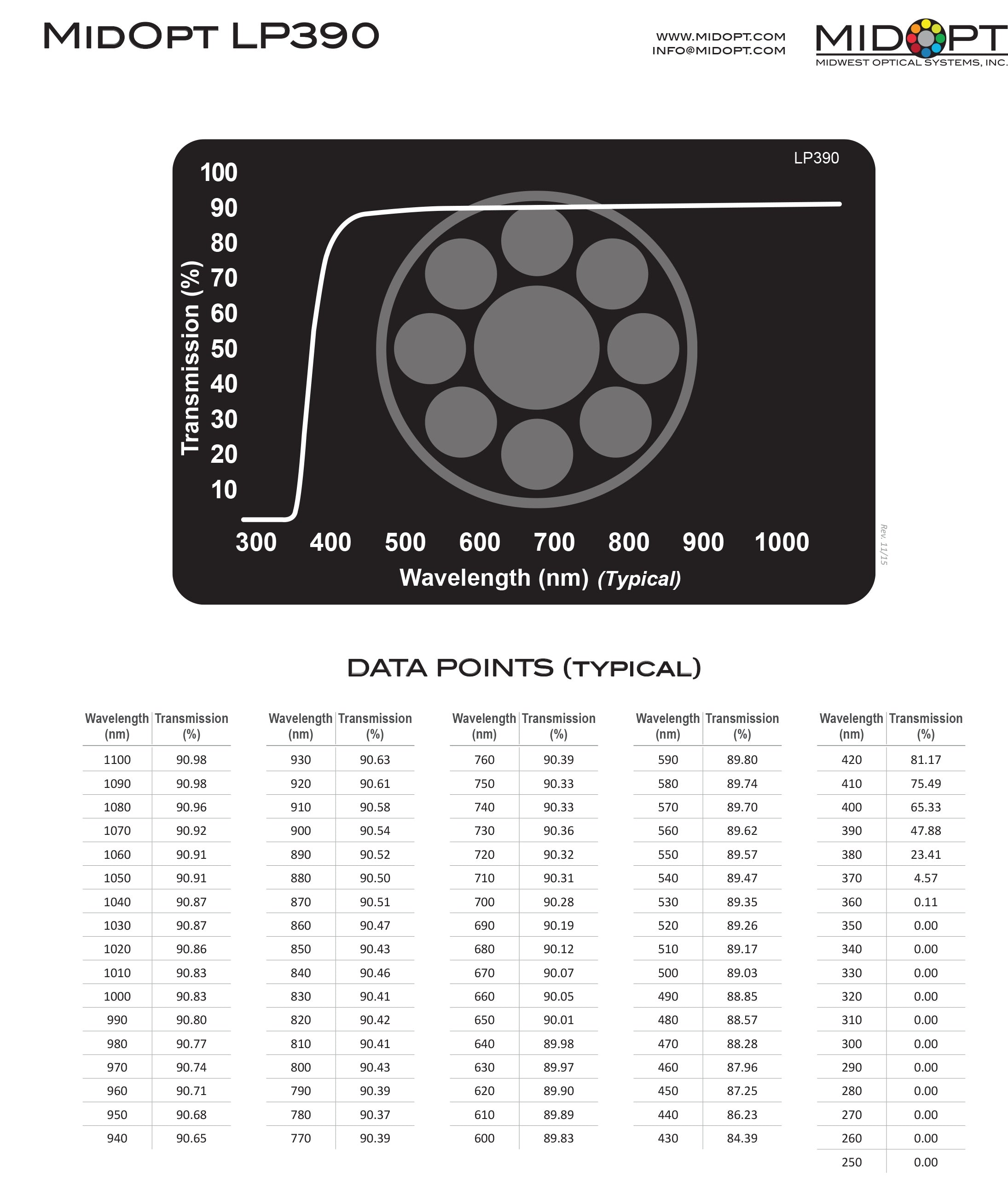 The MidOpt LP390 Ultraviolet (UV)-Absorbing Protective Window is used to block UV light while allowing high (>90%) visible (VIS) and near-infrared (IR) light transmission. Most silicon camera sensors have some sensitivity in the UV spectrum. In some color cameras this light can typically be recorded like blue light, resulting in an exaggerated bluish tint. The LP390 works well for color imaging applications, as they absorb UV light, and are also frequently used as protective windows, shielding expensive camera lenses from contamination and scratching over time or, in more challenging environments, even breakage. The LP390 has StablEDGE technology to reduce angular dependency and minimize the effects of short-shifting.