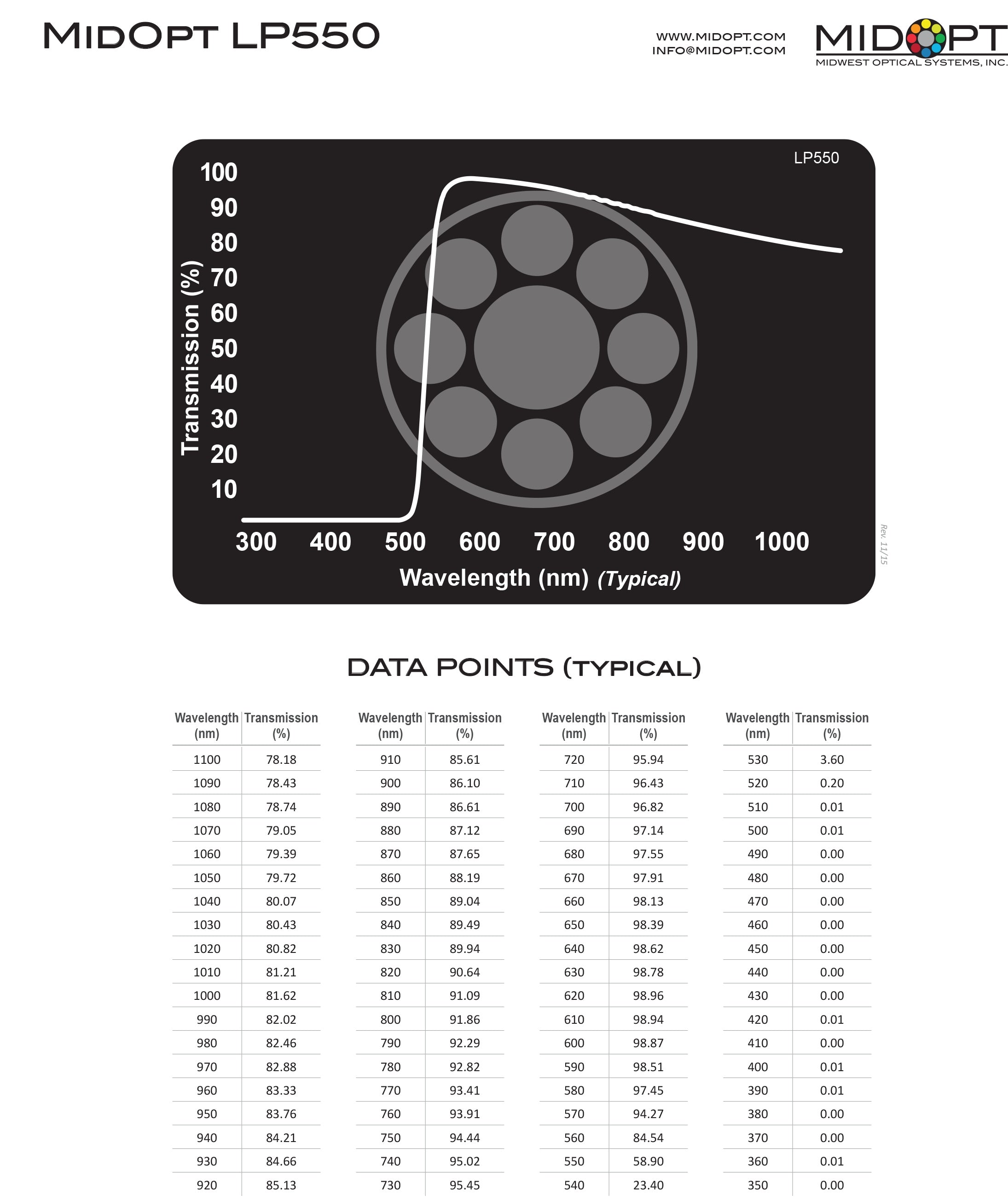 The MidOpt LP550 Orange Longpass Filter is used with a monochrome camera to increase contrast and resolution by blocking ultraviolet (UV) and shorter visible (VIS) wavelengths while passing orange, red and near-infrared (IR) light. Longpass filters are often referred to as "sharp-cut" filters and are specifically designed to pass a broad spectrum of longer wavelength light while blocking shorter wavelengths. They're commonly used in fluorescence applications to block an excitation light source or to pass multiple emission wavelengths, improving signal-to-noise ratio. To block longer wavelengths, including IR, which the camera may be sensitive to, the MidOpt BP595 is recommended. MidOpt Longpass Filters have a broad, Gaussian passband to mimic and accommodate the entire output of the most common LED wavelengths, are double-side polished for exceptional parallelism and optical flatness and are anti-reflection (AR) coated to limit glare and minimize reflection loss.