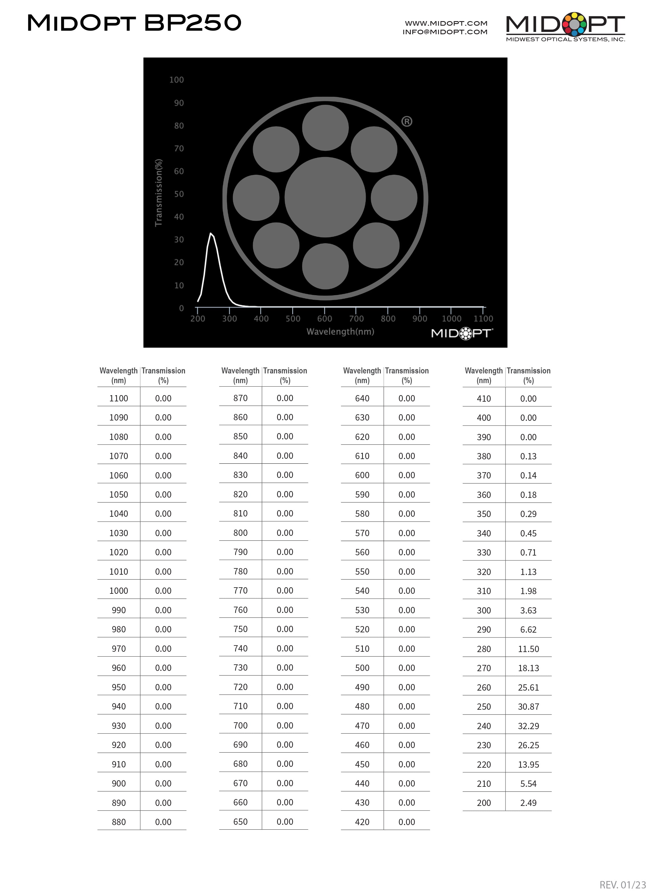 The MidOpt BP250 Deep-to-Near Ultraviolet (UV) Bandpass Filter is designed for deep-UV imaging applications, offering a broad transmission range from 240-260nm. It offers excellent visible (VIS) and near-infrared (IR) blocking (≤0.1% absorption at ≥400nm and ≤0.06% at ≥415nm) and is ideal for isolating features that are only visible under UV illumination. With a FWHM of 45nm and peak transmission of ≥30%, the BP250 is well-suited for applications requiring high UV sensitivity and minimal interference from longer wavelengths. This filter is not intended for use with standard CCD/CMOS cameras that do not image deep into the UV spectrum and is available in a limited range of sizes. It features a surface quality of 80/50 and a thickness of ≤3mm.