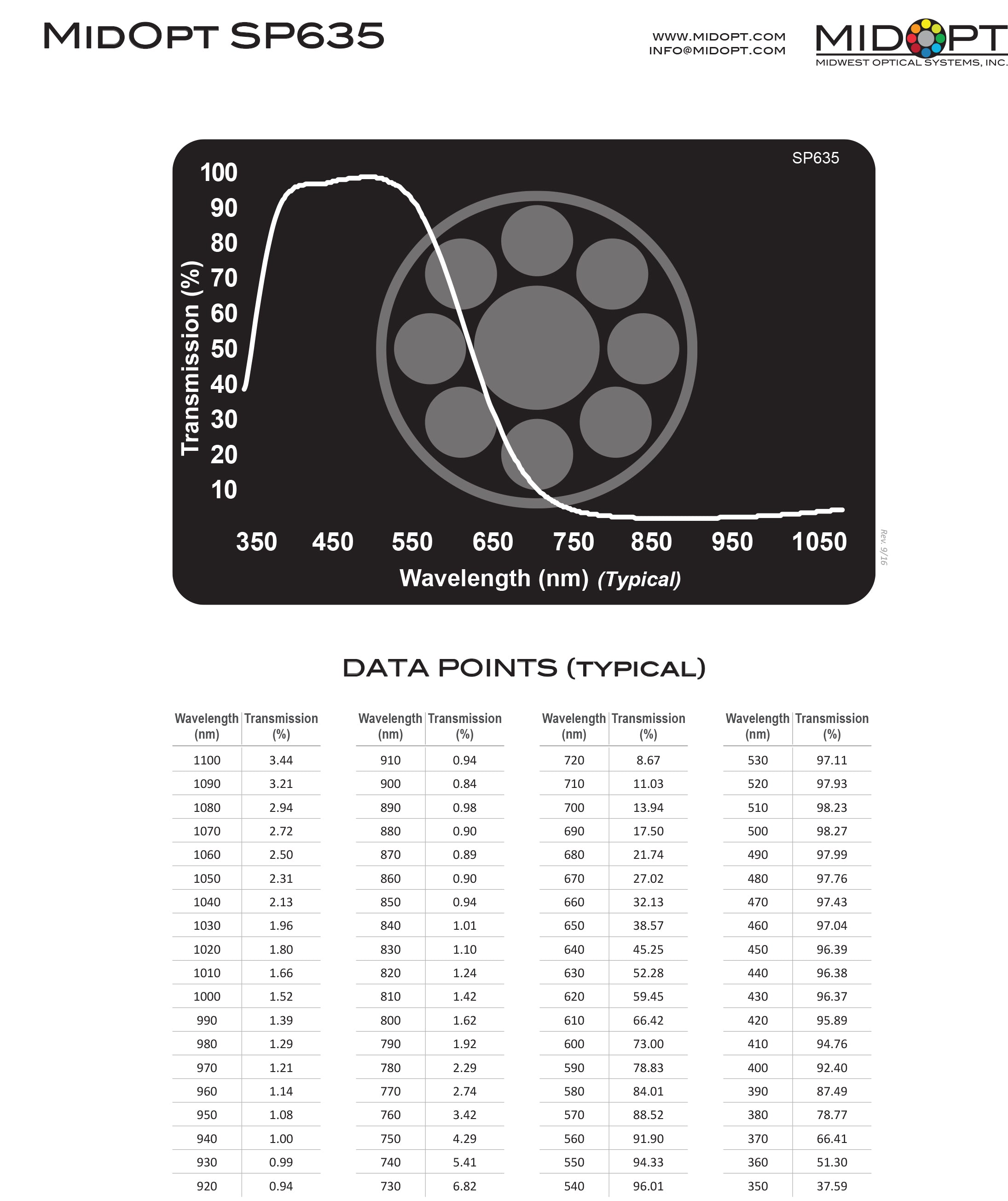 The MidOpt SP635 Absorptive Visible (VIS) Shortpass / Near-Infrared (IR) Block Filter is recommended for use inside a camera to block IR light. When working with any camera that has been modified to have its internal IR cut filter removed, an SP635 is mounted on the front of the lens when needed to return the camera's function to the unmodified version. As an absorptive IR block filter, it's also recommended for protecting the camera’s sensor from stray light emitted by lasers or other high power near-IR (NIR) light sources. MidOpt Shortpass Filters have a broad, Gaussian passband to mimic and accommodate the entire output of the most common LED wavelengths, are anti-reflection (AR) coated to limit glare and minimize reflection loss and have StablEDGE technology to reduce angular dependency and minimize the effects of short-shifting.