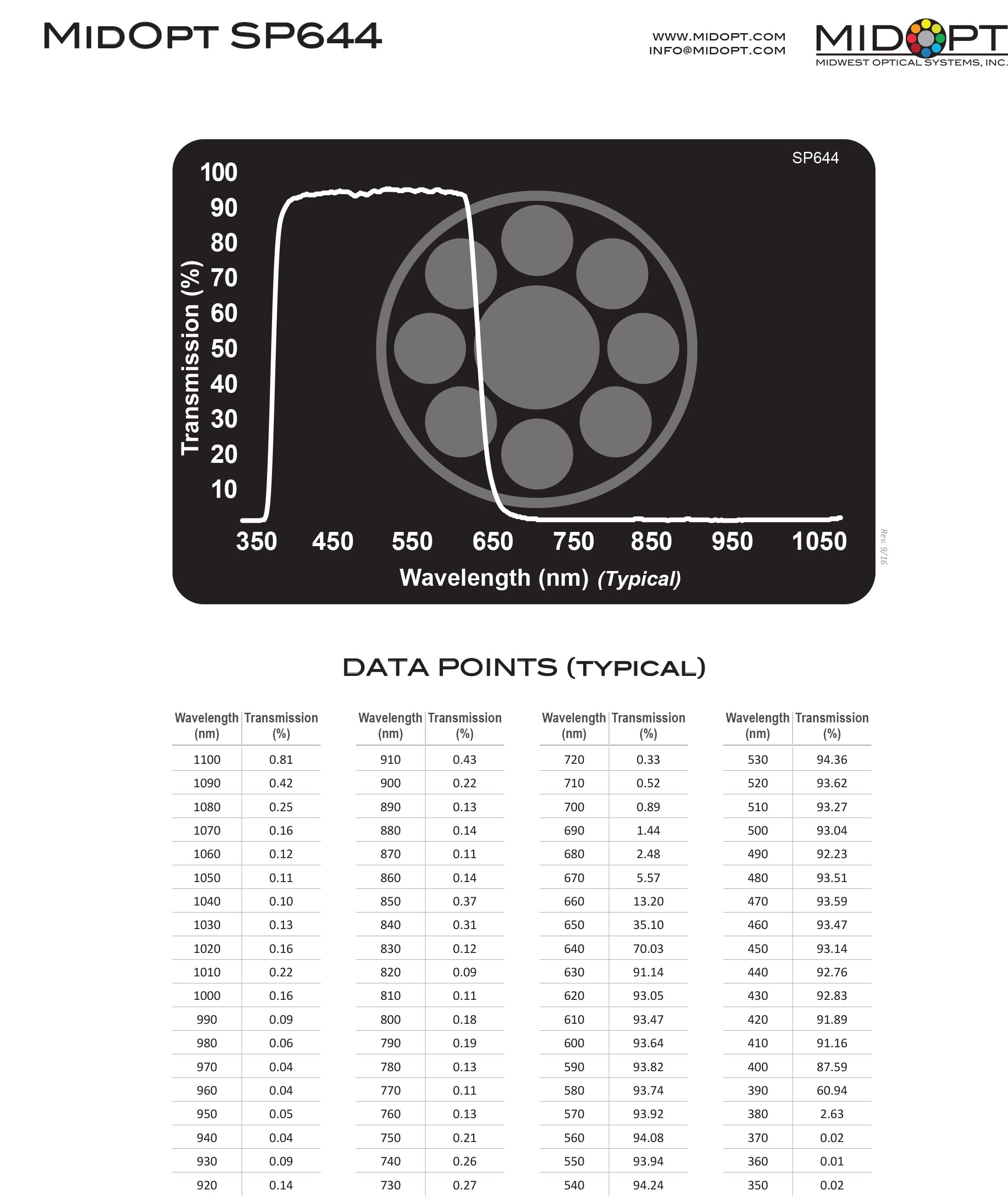 The MidOpt SP644 Near-Infrared (IR) / Mid-Red Dichroic Block Shortpass Filter is mainly used as an internal IR blocking filter in color cameras. The SP644 blocks near-IR (NIR) wavelengths out to 1100nm, has high transmission across the visible (VIS) range and has a 50% point in the middle of the red portion of the spectrum making it an ideal choice for cameras with typical CMOS sensor responsivity. The SP644 is useful to achieve natural color rendition with superior response in the blue channel. MidOpt Shortpass Filters have a broad, Gaussian passband to mimic and accommodate the entire output of the most common LED wavelengths and are anti-reflection (AR) coated to limit glare and minimize reflection loss.