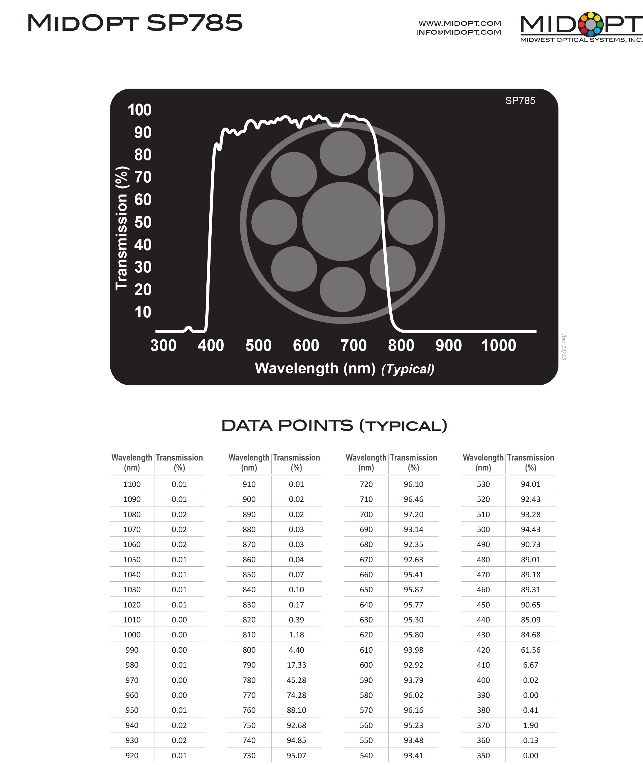 The MidOpt SP785 Modified Near-Infrared (IR) Dichroic Block Shortpass Filter passes visible (VIS) and shorter Near-IR (NIR) wavelengths and helps filter NIR light sources. In some cases, it can be a useful alternative to the DB735 filter. A broadband multilayer anti-reflection (AR) coating is present on the second surface. MidOpt Shortpass Filters have a broad, Gaussian passband to mimic and accommodate the entire output of the most common LED wavelengths.