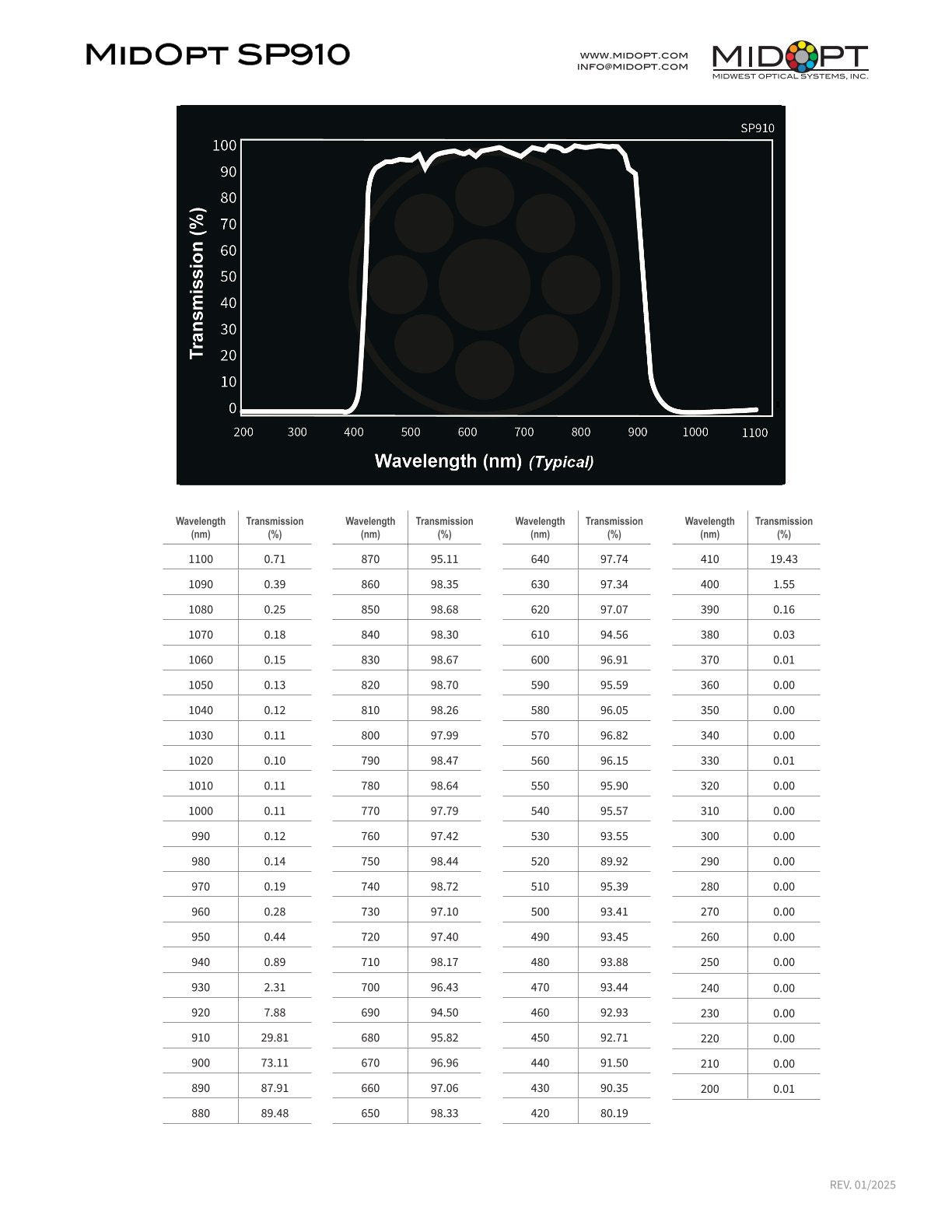 The MidOpt SP910 Near-Infrared (IR) Dichroic Shortpass Filter is useful for passing multiple wavelengths with a broad spectrum camera. The SP910 can be used in night vision goggle (NVG) simulation and can also be used with CMOS cameras and other silicon-based sensors to allow them to mimic the wavelength sensitivity range of most night vision devices. Applications military aircraft lighting inspection (external and in cockpits) and hyperspectral / multispectral imaging applications. A broadband multilayer anti-reflection (AR) coating is present on the second surface. MidOpt Shortpass Filters have a broad, Gaussian passband to mimic and accommodate the entire output of the most common LED wavelengths.